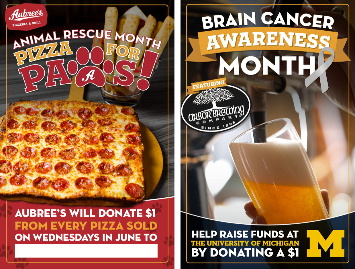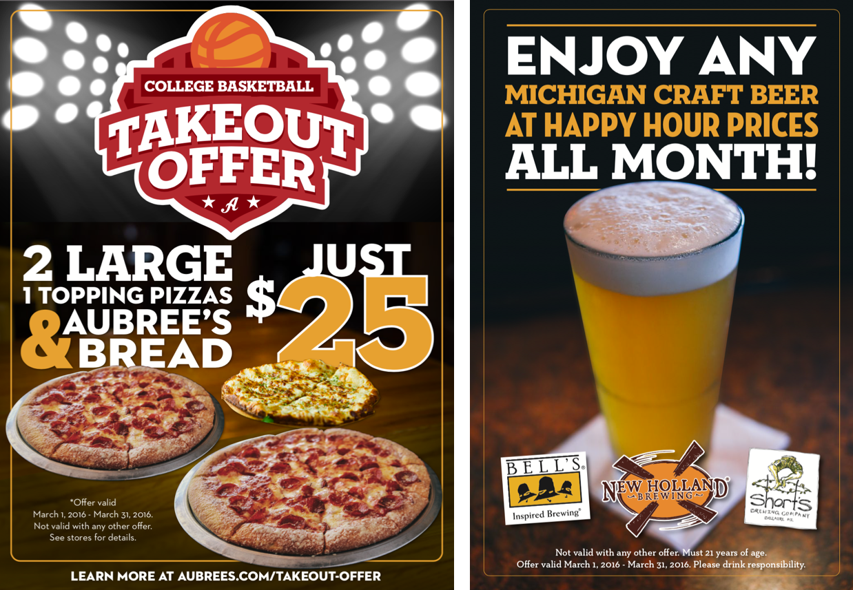 I had the pleasure of designing a set of marketing materials for Aubree’s Pizzeria & Grill. Infused with the company's delicious energy, the materials included a dynamic set of flyers, table tents, coasters, and a website banner, as well as a set of logos for various campaigns they ran. These materials harmoniously blended aesthetics and appetite appeal, giving the Aubree’s Pizzeria & Grill a fresh and unforgettable visual identity that resonated with pizza lovers and left a lasting impression on anyone who came across them.